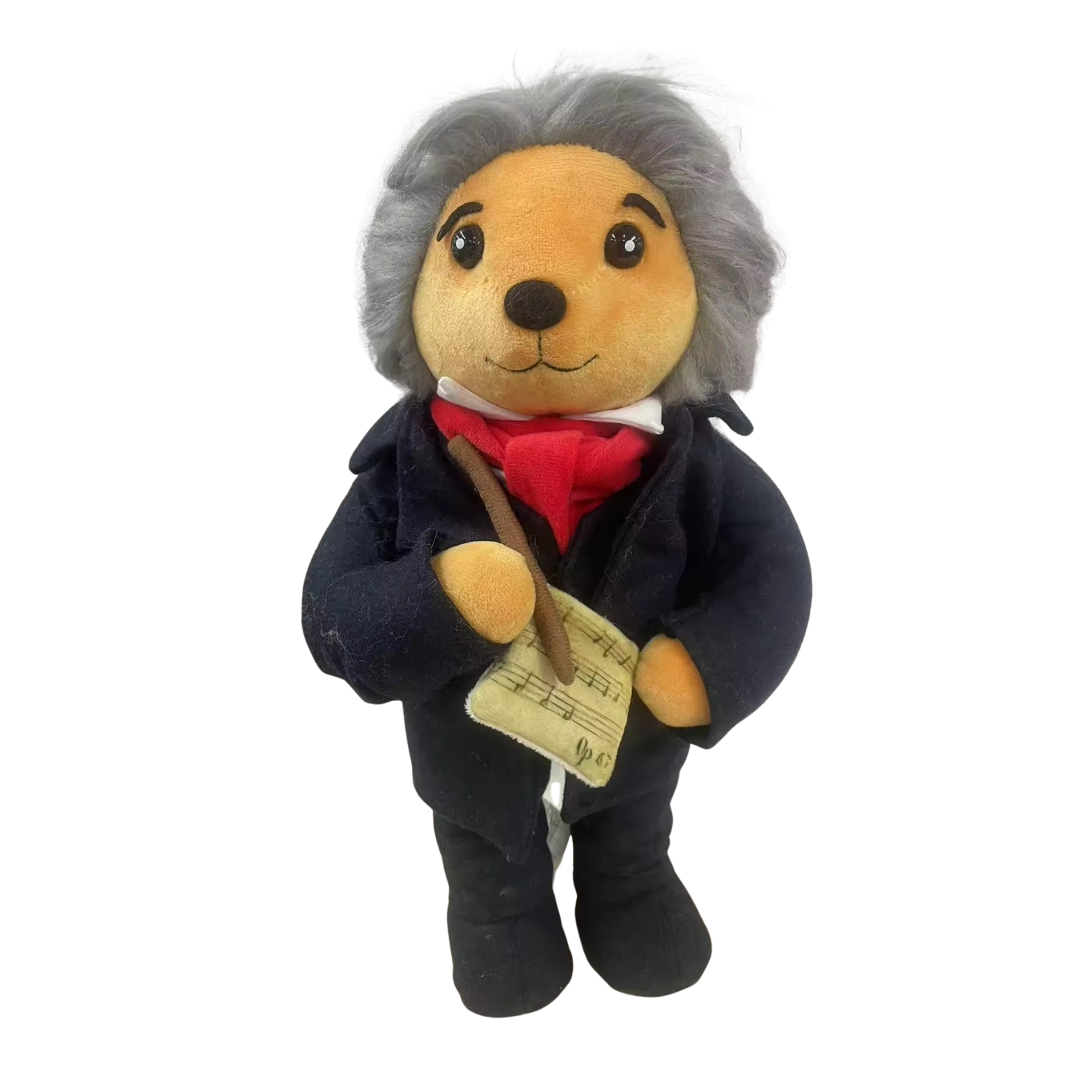 Gekleidet in einen eleganten schwarzen Frack, mit rotem Halstuch und einem Notenblatt in den Pfoten, greift der Beethovenbär die ikonische Erscheinung des berühmten Komponisten auf – ohne dabei seine freundliche und zugängliche Ausstrahlung zu verlieren. Die sorgfältige Ausarbeitung der Details, von der Mimik bis zur Kleidung, verleiht dem Bären Charakter und eine zeitlose Präsenz.